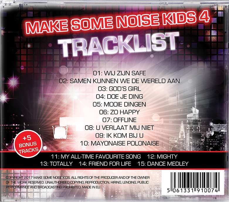 Ga helemaal los op het vierde deel van de Make Some Noise Kids serie! ‘Wij zijn safe’, ‘God’s Girl’ en ‘Samen kunnen we de wereld aan’ Dit een album waar je kids een groot plezier mee doet. Voetjes van de vloer!